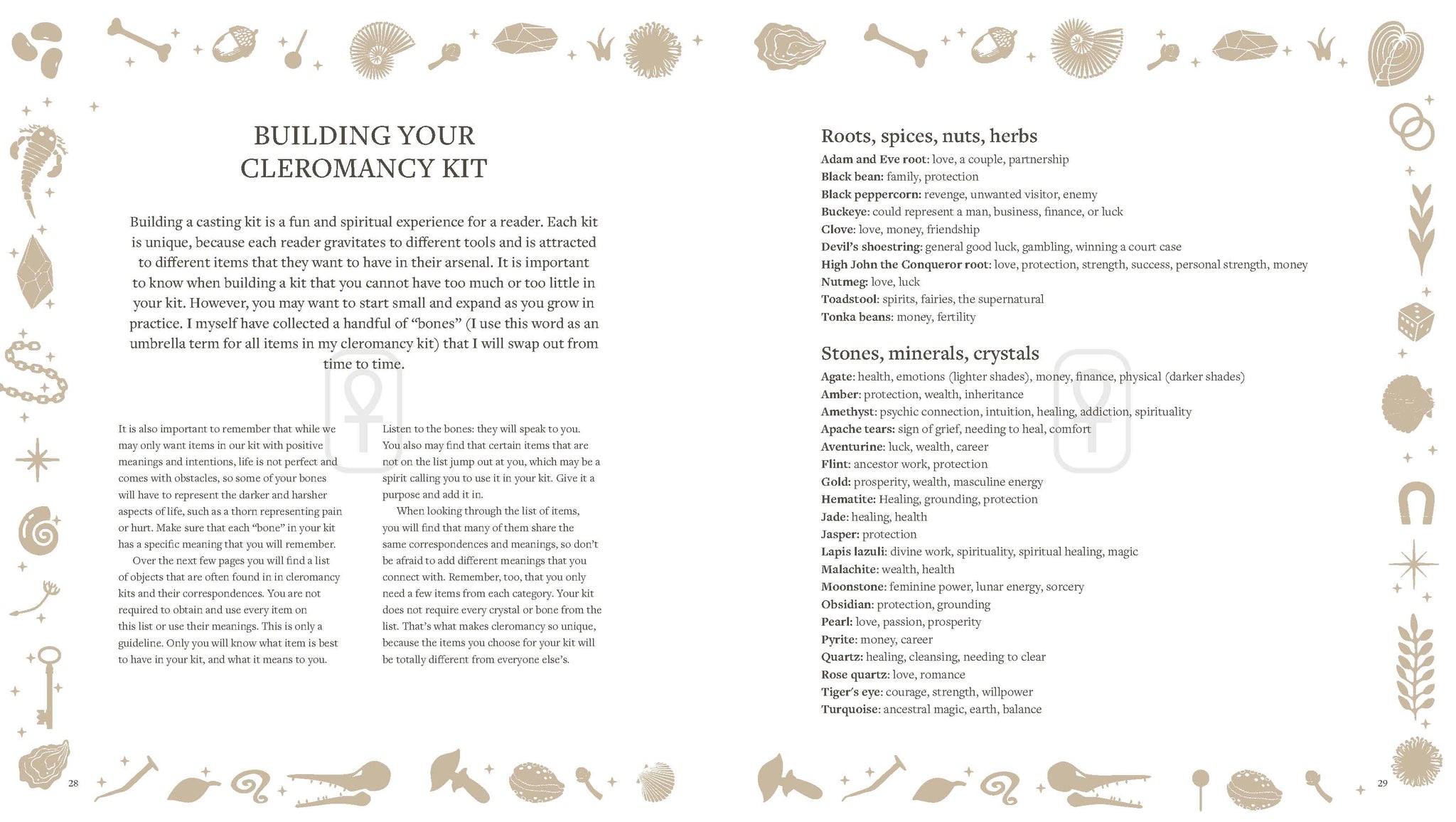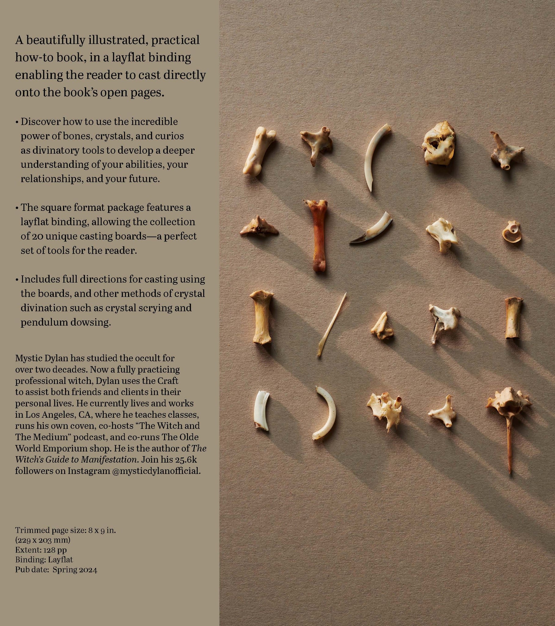 Fortune casting, or throwing bones and other objects for divination, is an age-old magical practice. “Bones” are like totems and can be any item: something from nature, like shells, roots, or crystals, or trinkets and found objects, like dice, coins, or keys. Whatever you use, casting will help you create a definitive divination system based on your personal practice. It is through casting that you can truly enhance your intuition and connect to the spiritual, earthly, and supernatural realms. Through collecting your objects, you are building a unique alphabet and language that will help you answer important questions. This beautifully illustrated, practical how-to book contains everything you need to know to get started with fortune casting including; advice and suggestions for creating your own set of “bones”, 20 unique casting layouts with instructions on how to use them—just lay the book flat and cast directly onto the page, and more.